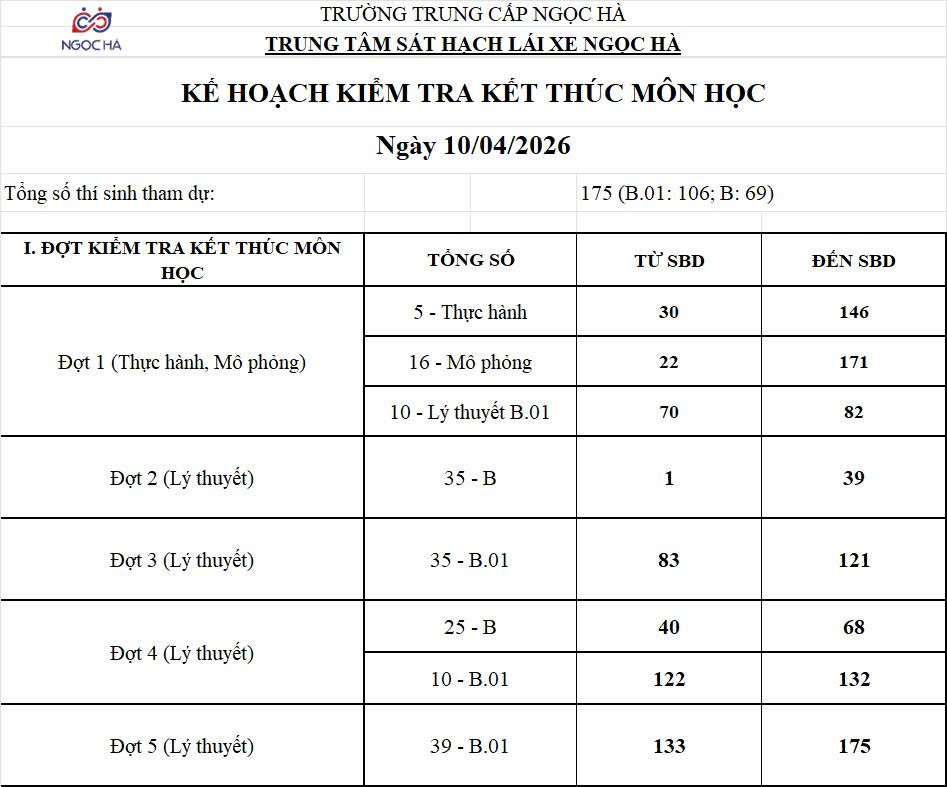 | CƠ SỞ ĐÀO TẠO : TRƯỜNG TRUNG CẤP NGỌC HÀ KỲ KIỂM TRA HẾT MÔN NGÀY 10 THÁNG 04 NĂM 2026 (Anh/ chị học viên có thể tra cứu số báo danh tại trang: http://ngochaco.com) |