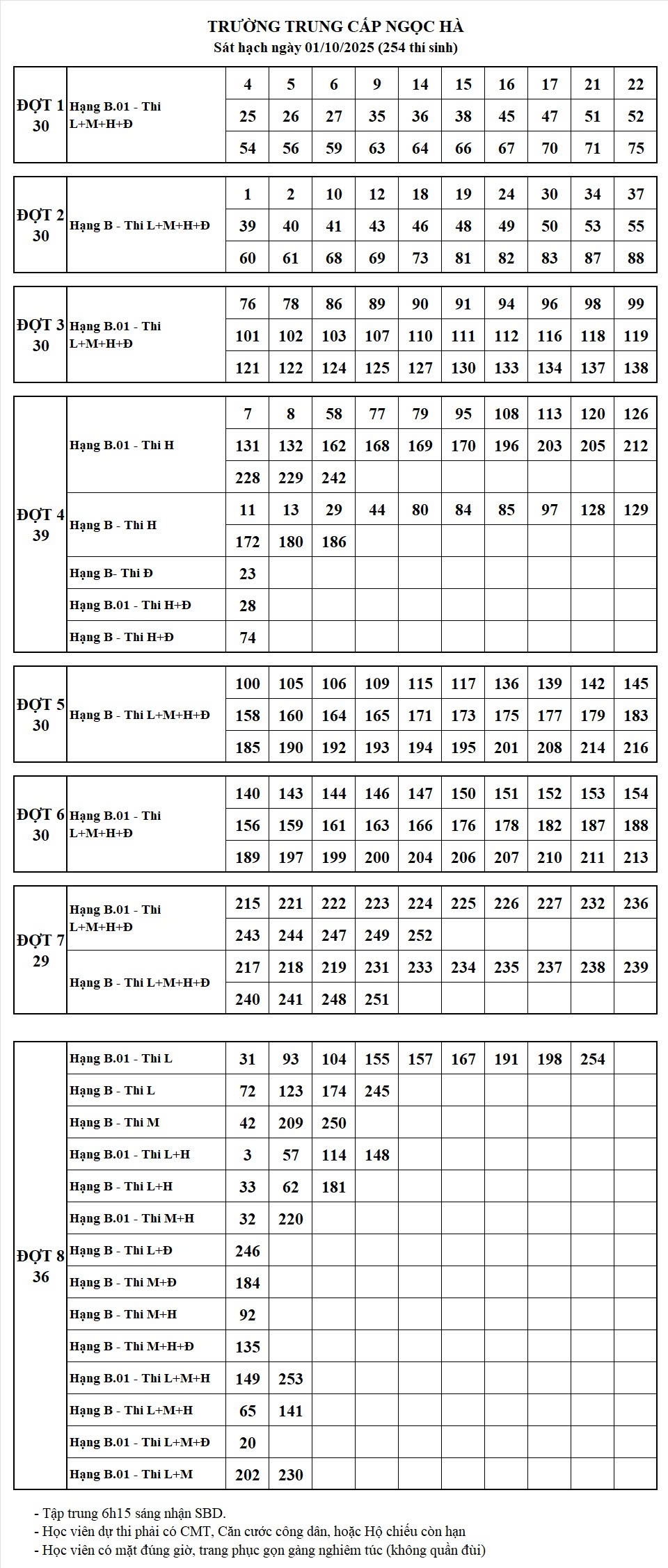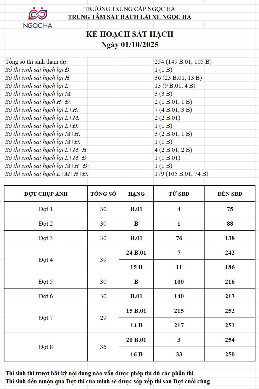 CƠ SỞ ĐÀO TẠO : TRƯỜNG TRUNG CẤP NGỌC HÀ KỲ SÁT HẠCH NGÀY 01 THÁNG 10 NĂM 2025 (Anh/ chị học viên có thể tra cứu số báo danh tại trang: http://ngochaco.com) |