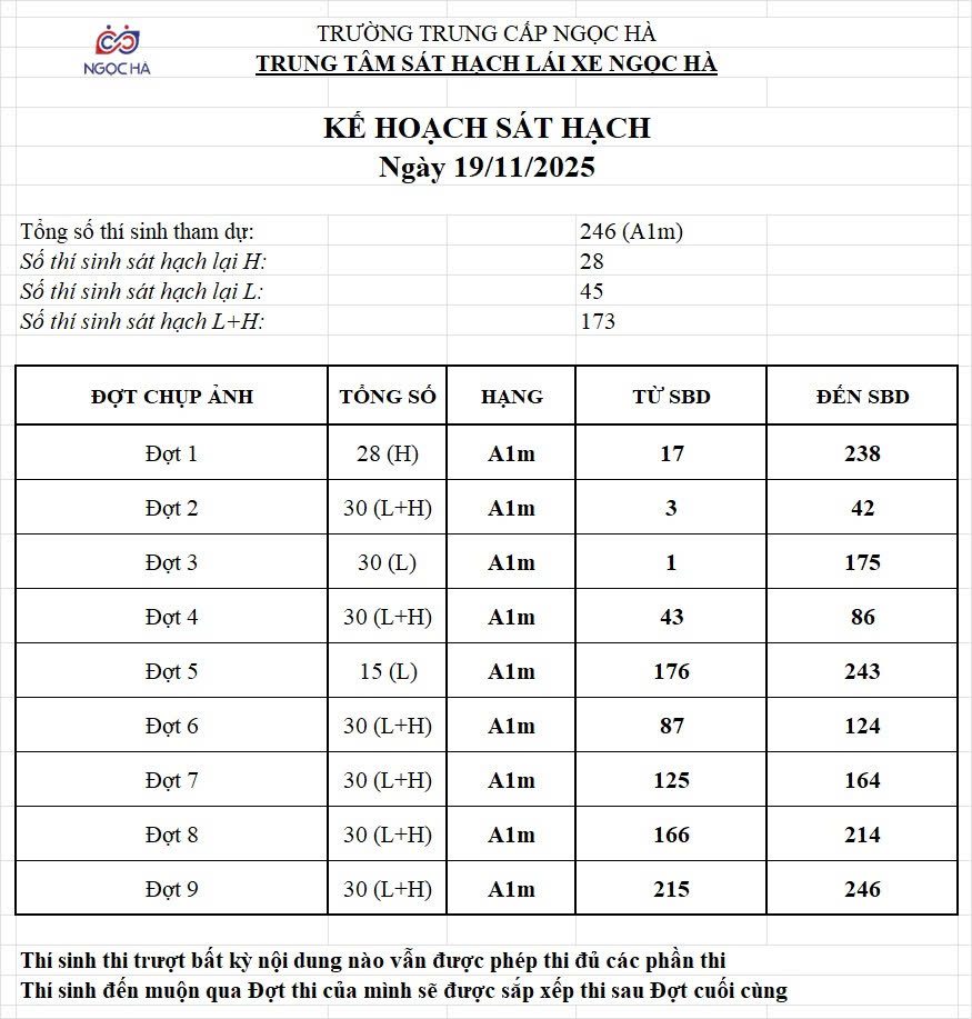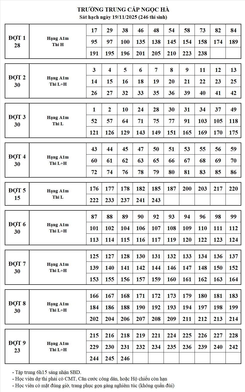 DANH SÁCH THÍ SINH DỰ SÁT HẠCH MÔ TÔ 19/11/2025