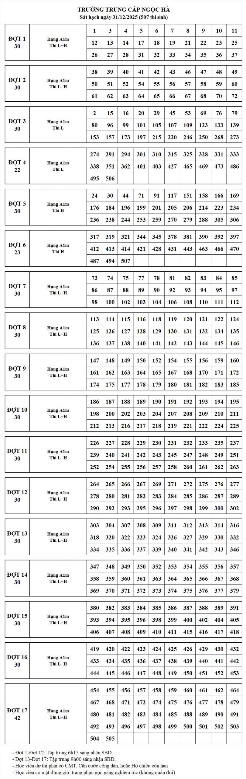 | CƠ SỞ ĐÀO TẠO : TRƯỜNG TRUNG CẤP NGỌC HÀ KỲ SÁT HẠCH NGÀY 31 THÁNG 12 NĂM 2025 (Anh/chị học viên có thể tra cứu số báo danh tại trang: http://ngochaco.com) |