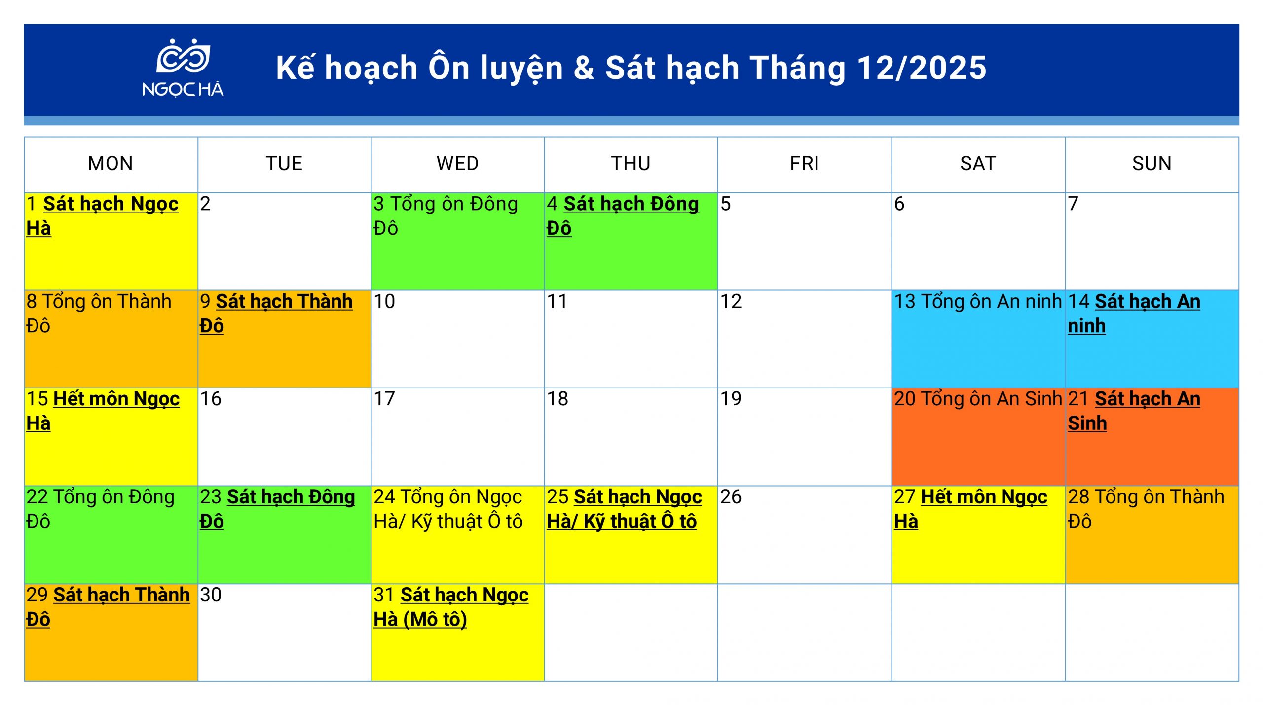 Kế hoạch ôn luyện – sát hạch tháng 12/2025 Trường Trung cấp Ngọc Hà trân trọng thông báo kế hoạch ôn luyện – sát hạch tháng 12/2025 như sau Lưu ý: -15/12: Hết môn B-K17/2025 -27/12: Hết môn BTD-K18/2025 Share This Article Share on FacebookShare on Facebook TweetShare on Twitter Pin itShare on Pinterest Share on LinkedInShare on LinkedIn Share on WhatsAppShare on WhatsApp Post navigationPreviousPrevious post:TUYỂN DỤNG NHÂN VIÊN TRUNG TÂM ĐÀO TẠO & SÁT HẠCH LÁI XEBài viết khácTUYỂN DỤNG NHÂN VIÊN TRUNG TÂM ĐÀO TẠO & SÁT HẠCH LÁI XE2 Tháng Mười Hai, 2025DANH SÁCH THÍ SINH DỰ SÁT HẠCH 01/12/202529 Tháng Mười Một, 2025DANH SÁCH THÍ SINH DỰ KIỂM TRA HẾT MÔN 29/11/202528 Tháng Mười Một, 2025DANH SÁCH THÍ SINH DỰ SÁT HẠCH 21/11/202520 Tháng Mười Một, 2025DANH SÁCH THÍ SINH DỰ SÁT HẠCH MÔ TÔ 19/11/202515 Tháng Mười Một, 2025THÔNG BÁO ĐĂNG KÝ CHUYỂN HẠNG C13 Tháng Mười Một, 2025